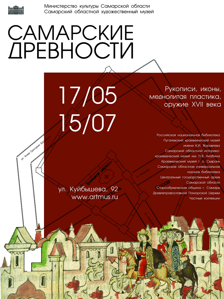 Выставка «Самарские древности» объединяет фонды Российской национальной библиотеки, Самарского областного художественного музея, Самарского областного историко-краеведческого музея имени П.В. Алабина, Пугачёвского краеведческого музея имени К.И. Журавлёва, Краеведческого музея городского округа Сызрань, Старообрядческой общины г. Самары Древлеправославной Поморской церкви, Самарской областной универсальной научной библиотеки, Центрального государственного архива Самарской области и частных коллекций. Многие памятники культуры, представленные на выставке, хранятся в запасниках и будут показаны впервые.