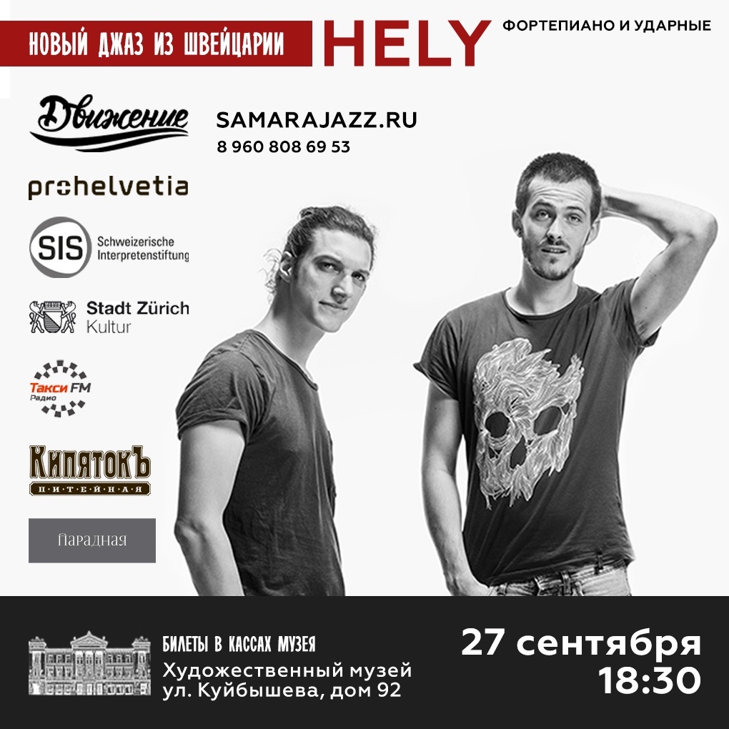 7 сентября в 18.30 там же, в Мраморном зале, мы ждем Вас на концерт «Швейцарский джаз. Группа Hely» молодых музыкантов из альпийской республики - барабанщика Йонас Рутера и пианиста Луки Фриса, которые исполнят музыку в стиле «транс-джаз». Программа их выступления охватывает широкий диапазон самых разных произведений от джазовых классиков до авангарда.