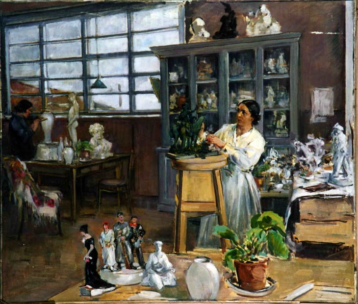 Тихова М.Л. "Скульптурная лаборатория Ломоносовского фарфорового завода". 1936-1937 гг. Х., м. 141,5х168,5 см.