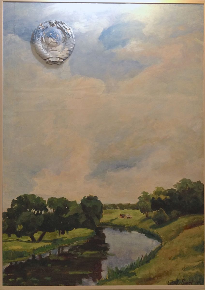 2. «Соц-арт». Включает два крупноформатных полотна Леонида Сокова, одного из ключевых представителей жанра соц-арта – иронической ветви московского концептуализма, подвергавшей деконструкции "мертвый" язык социалистического реализма, помещая его символы и мотивы в новые контексты. Работы Сокова поступили в музей в 1995 году из коллекции Инкомбанка.