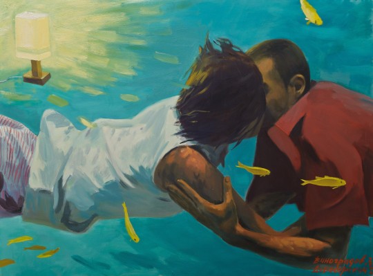 Александр Виноградов и Владимир Дубосарский (р. 1963 и 1964), работающие в соавторстве, в самом разгаре 90-х (десятилетия расцвета перформанса) предложили в качестве актуального художественного продукта традиционную картину, более того, картину, формально наследующую эстетике социалистического реализма. При этом образный ряд их картин отсылал к современной массовой культуре, рекламе, глянцу и шоу-бизнесу. Мир Виноградова-Дубосарского – эйфорическая утопия и вечный гламурный позитив, но изображенные средствами «мертвой», отжившей поэтики, да еще и в крупном вплоть до гигантизма формате. Эффект живописи художников – в постоянном конфликте этих двух миров. Так, средствами формы художники критиковали современную им эпоху тотального потребления, которой в первую очередь были 2000-е годы. Подобная эстетика оказалась актуальной и востребованной. В нулевые годы Виноградов и Дубосарский стали едва ли не самыми коммерчески успешными художниками России, их работы разошлись по статусным музейным коллекциям. Картина «Поцелуй» - одна из серии, изображающей очередную авторскую утопию, в данном случае – вымышленный подводный город, населенный счастливыми обитателями.