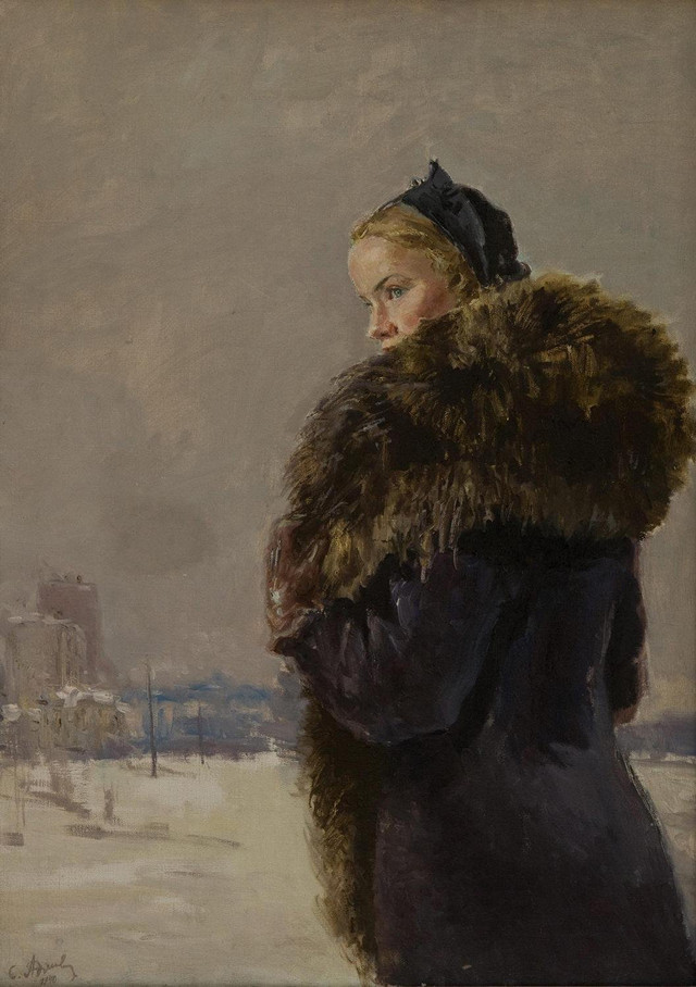 «Женский портрет» выполнен в духе традиционализма и отражает повседневную жизнь определенных слоев советского общества. На портрете мы видим женщину одетую по моде 40-х годов в пальто с широким меховым воротником, подкладными плечами и рукавом реглан.