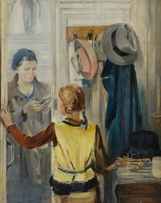 Один из лидеров ОСТа (Общество художников-станковистов) Юрий Пименов, с начала 1930-х отказываясь от экспрессионистической манеры, обращается к импрессионистической, уйдя от индустриальной тематики к созданию лирических новелл. На картине «Почта пришла» изображен эпизод повседневного московского быта – утренний приход почтальона, дверь которому открывает девочка-подросток. Всё здесь располагает к тихому, спокойному созерцанию: голубовато-золотистый колорит, пронизанный светом интерьер подъезда. Женщина-почтальон перебирает письма, девочка ждет, мы видим ее со спины, кто-то поднимается вверх по лестнице. К нам повернуто лишь лицо почтальона, но она трактована, скорее, как плакатный персонаж. Тогда что же здесь особенно привлекает внимание, почему не хочется отходить от этой работы? Дело в том, что в ней незримо присутствуют еще двое – это родители девочки: мы видим на вешалке их шляпы, плащи, на тумбочке – изящные женские перчатки. Если дольше смотреть на картину, начинаешь ощущать, что вещи со своими подчеркнуто гендерными цветами как бы выходят на первый план, подменяя своих владельцев, свидетельствуя как о каждом из них, так и о времени, в котором они живут. Розовая, женственная шляпка с пером, светлый плащ, выглядывающий из-под синего брутального мужского.